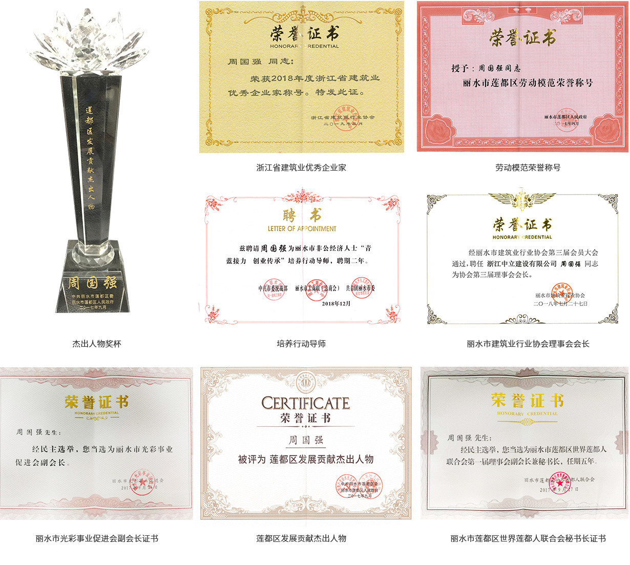 2018年7月當選為麗水市建筑業行業協會理事會會長,2019年3月被浙江省建筑業行業協會評為2018年度浙江省建筑業優秀企業家。