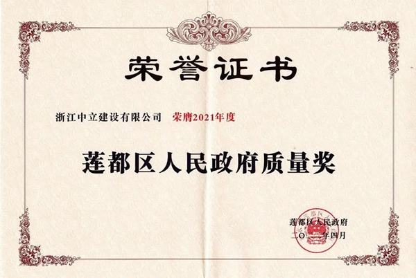 為增強全社會質量意識,引導和激勵全區各行各業加強質量管理,促進轉型升級,帶動高質量發展,根據《蓮都區人民政府質量獎管理辦法》(蓮政辦發〔2021〕49 號)規定,經嚴格評審,決定授予浙江中立建設有限公司“2021年蓮都區人民政府質量獎”。