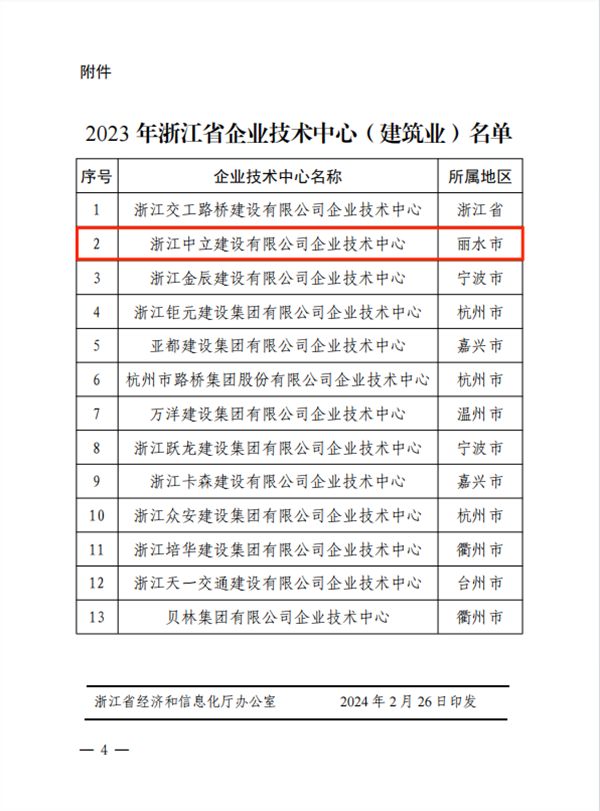 近日,浙江省經濟和信息化廳等五部門公布2023年建筑業領域浙江省企業技術中心名單的通知,我公司企業技術中心榮獲2023 年建筑業領域浙江省企業技術中心認定。